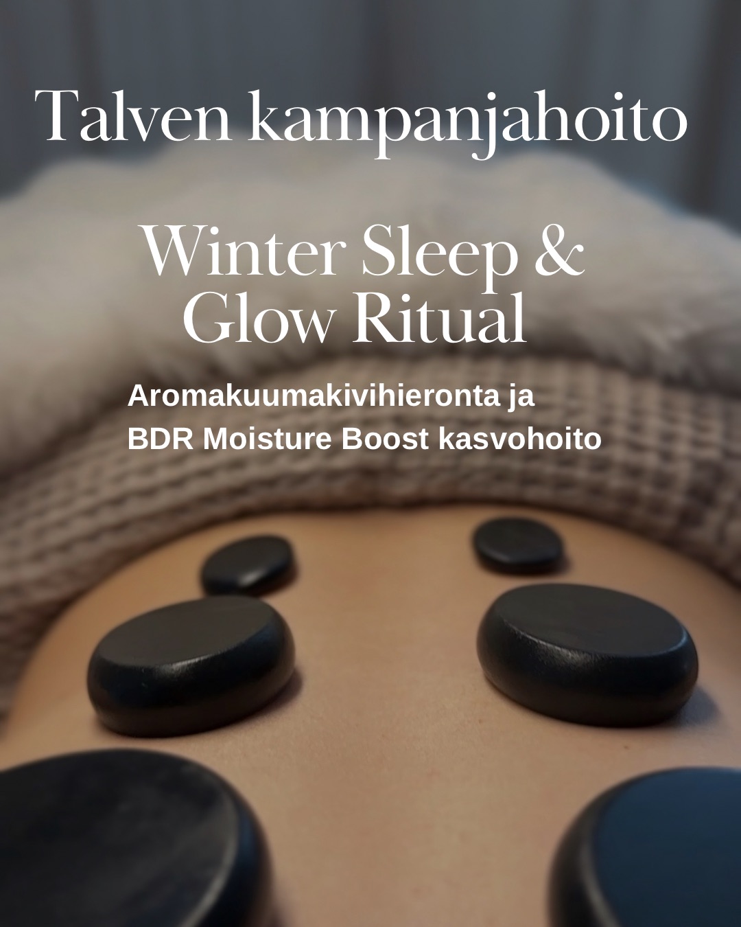 Syvärentouttava hemmottelupaketti, joka rauhoittaa kehon, tukee hermoston palautumista, parantaa unen laatua ja palauttaa talvi-ihon kosteustasapainon. Hoito alkaa lämpimällä kuumakivihieronnalla, jossa käytetään unta tukevia laventeli–kamomilla–magnesiumöljyjä, ja jatkuu talvi-iholle suunnitellulla kosteuttavalla BDR Moisture Boost -kasvohoidolla, joka syväkosteuttaa, täyteläistää ja silottaa talvi-ihon, jättäen sen pehmeäksi ja hehkuvaksi. Hoidon päätteeksi saat pienen lahjan.